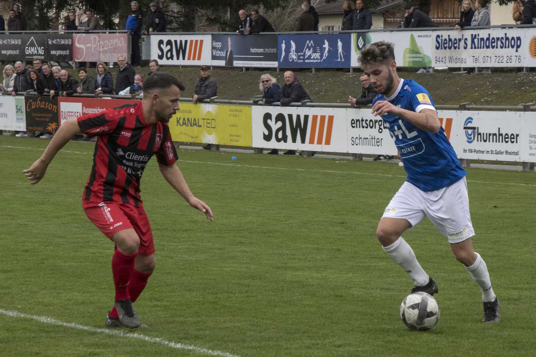 Doch es kam anders: In der 18. Minute setzte sich der laufstarke Timon Cabezas gegen Nick Romer durch und passte ins Zentrum, wo Tüccar platziert zum 1:0 traf. Jetzt erwartete man einen Sturmlauf der Gäste, doch mehr als einen Schuss von Aussenverteidiger Roman Scardanzan, den Kovacic entschärfte, liess die Widnauer Verteidigung nicht zu. Nach 31 Minuten erhöhte Widnau sogar auf 2:0: Samuel Thönig erlief sich mithilfe der Eckfahne einen langen Ball gerade noch, bevor er die Spielfeldbegrenzung überschritt. Seine Flanke verwertete Noah Thönig mit einer sehenswerten Direktabnahme.