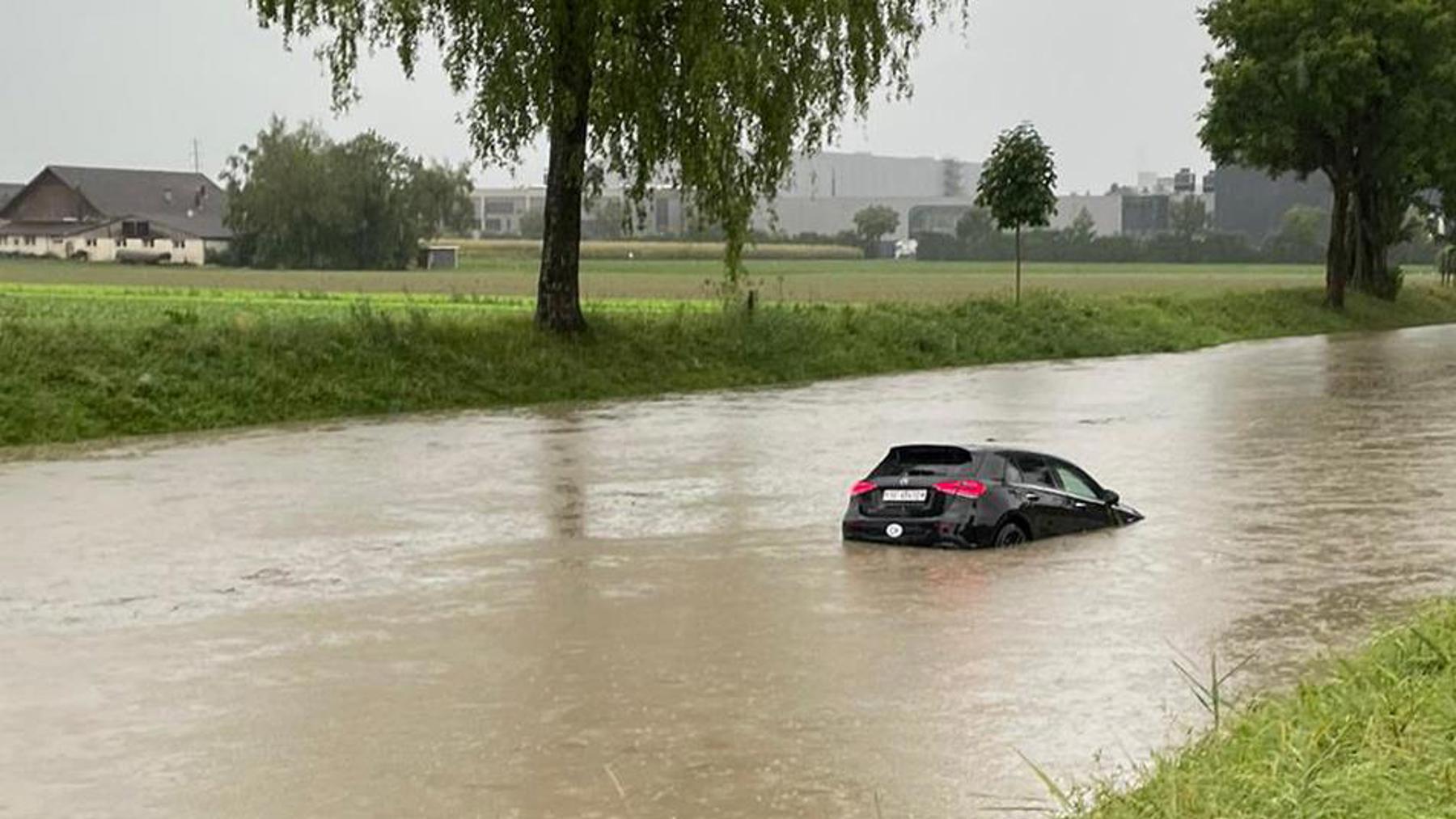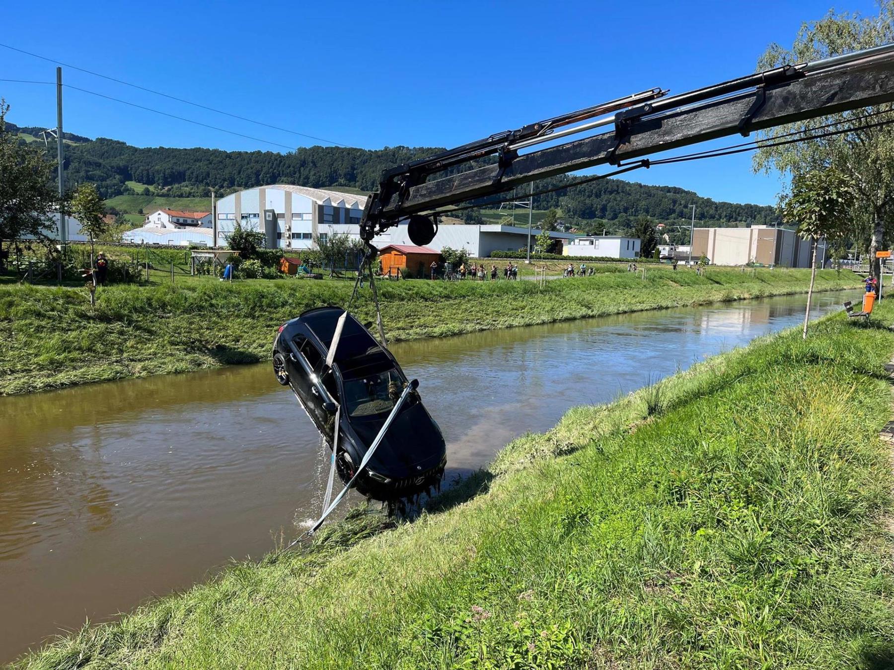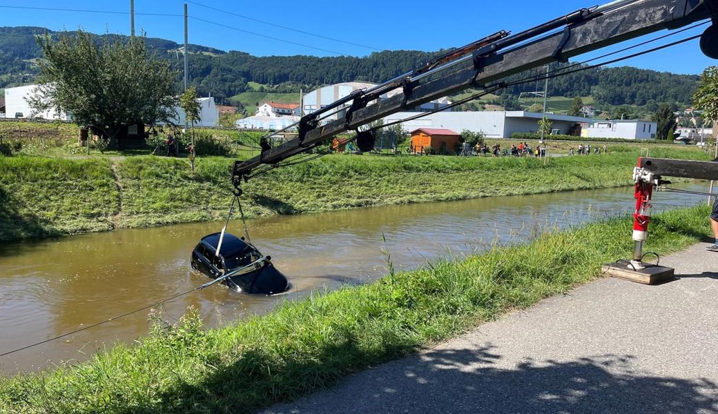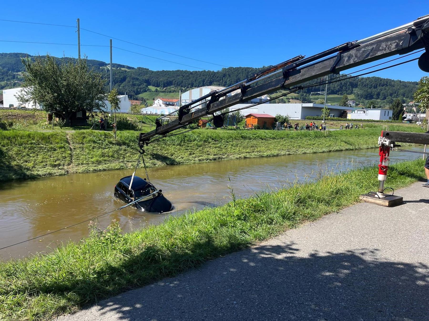 Am Freitag, als es in Strömen regnete, fuhr ein 19-Jähriger auf der Espenstrasse in Widnau Richtung Au. Bei einem Selbstunfall geriet er mit dem Auto über die Böschung und landete im Binnenkanal. Er konnte das Auto ohne Verletzungen verlassen und ans Ufer schwimmen. Das Auto trieb in den Wassermassen fort und blieb bis am Samstagabend verschwunden, da sich die Suche für die Feuerwehr und Polizei aufgrund des hohen Pegelstandes schwierig gestaltete.«Am Samstagabend gegen 20.45 Uhr konnte das Autos geortet werden», sagt Hanspeter Krüsi, Mediensprecher der Kantonspolizei St. Gallen. «Am Sonntagnachmittag wurde das Auto schliesslich mit einem Kran aus dem Kanal gehoben.» Das Auto wurde ziemlich genau einen Kilometer nach der Unfallstelle gefunden.