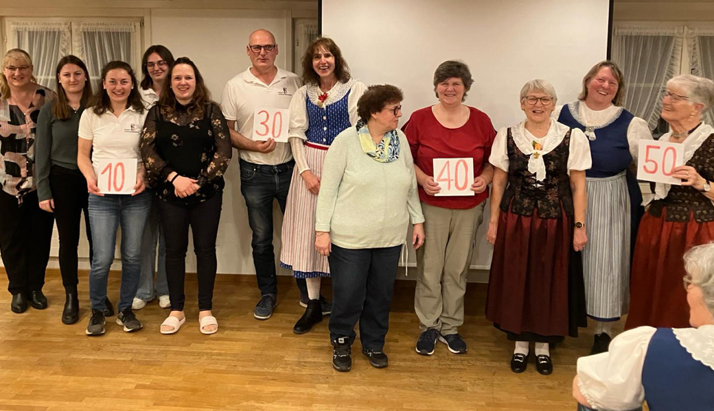 Mit grosser Freude durften an dieser Versammlung ein Jubilar und 13 Jubilarinnen geehrt werden. Es sind dies: Brigitte Ritter, Sabine, Manuela und Janine Ritz, Nadja Thurnherr (es fehlen Eva-Maria und Salomé Mutzner) für zehn Jahre Mitgliedschaft; Köbi Ritz und Regula Benz für 30 Jahre; Priska Steiger, Brigitte Thurnherr, Esther Eugster und Vreni Fehr (Tanzleiterin) für 40 Jahre und Antonia Kobler für 50 Jahre. Mit einem Präsent wurde ihnen herzlich gratuliert. Auch ein neues Mitglied durfte begrüsst werden.