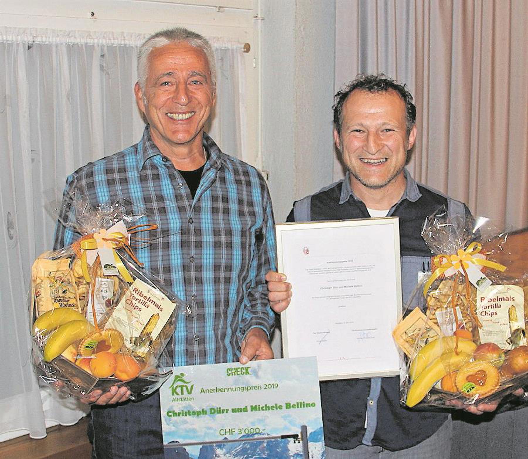 Mit Hilfe ihrer ebenfalls sportbegeisterten Gattinnen, auf deren Unterstützung Christoph Dürr und Michele Bellino immer zählen konnten, war die Preisverleihung eine grosse Überraschung. Wirklich erst nach der Bürgerversammlung erfuhren die Geehrten, dass die fünfköpfige Jury sie als Preisträger auserkoren hatte.Die Laudatio der Präsidentin Jennifer Jensen-Zünd hielt für sie der ebenfalls der Jury angehörende Stadtrat Toni Loher, weil die Laudatorin selbst nicht am Anlass teilnehmen konnte.Dreimal trainieren, oft an WettkämpfenDie Begeisterung und Hingabe der Geehrten sei «ansteckend, das Feuer flackert intern im Verein und in der Familie weiter», hiess es.Beim KTV Altstätten wirkt Michele Bellino seit 30 Jahren als Trainer, Christoph Dürr sogar seit 40 Jahren. Zusammen also während 70 Jahren haben sie den Nachwuchs und die Elite trainiert. Bellino ist ausgebildeter Nationaltrainer, Dürr hat die zweithöchste Ausbildung absolviert. Dreimal wöchentlich trainieren die beiden die Sportler in der Turnhalle oder auf dem Sportplatz, und fast jedes Wochenende sind sie irgendwo in der Schweiz an einem Wettkampf, einem Meeting oder sogar einer Schweizermeisterschaft. Ausserdem haben sie öfter in Magglingen mit verheissungsvollen Talenten zu tun, und jährlich führen sie diverse Trainingslager durch. Kein Wunder, sind Michele Bellino und Christoph Dürr längst Ehrenmitglieder des KTV.Nicht nur sportlich ist das Duo überaus aktiv, die beiden berichten auch regelmässig in den Lokalzeitungen über leichtathletisches Geschehen.Ihre Athleten gewannen 119 MedaillenBis heute sammelten die Athleten der beiden Trainer allein an Schweizermeisterschaften 119 Medaillen. 37 mal war es Gold, 39AABB22mal Silber, 43 mal Bronze.Die Jury sei sich sofort einig gewesen, dass der 14. Anerkennungspreis der Stadt Michele Bellino und Christoph Dürr gehöre – aufgrund ihres Einsatzes ebenso wie aufgrund ihrer Eigenschaften. Als gute Trainer verstünden sie nicht nur viel von der Materie, sie seien zudem ehrlich, konsequent, hätten ein feines Gespür, motivierten mit Spass, seien Vorbilder und verfügten insgesamt über all jene Eigenschaften, die auch eine gute Führungskraft in der Wirtschaft haben sollte.Die herausragenden Resultate ihrer Athleten seien Beweis genug, dass Michele Bellino und Christoph Dürr sehr gute, ja hervorragende Trainer seien, schloss Toni Loher.Gert Bruderer