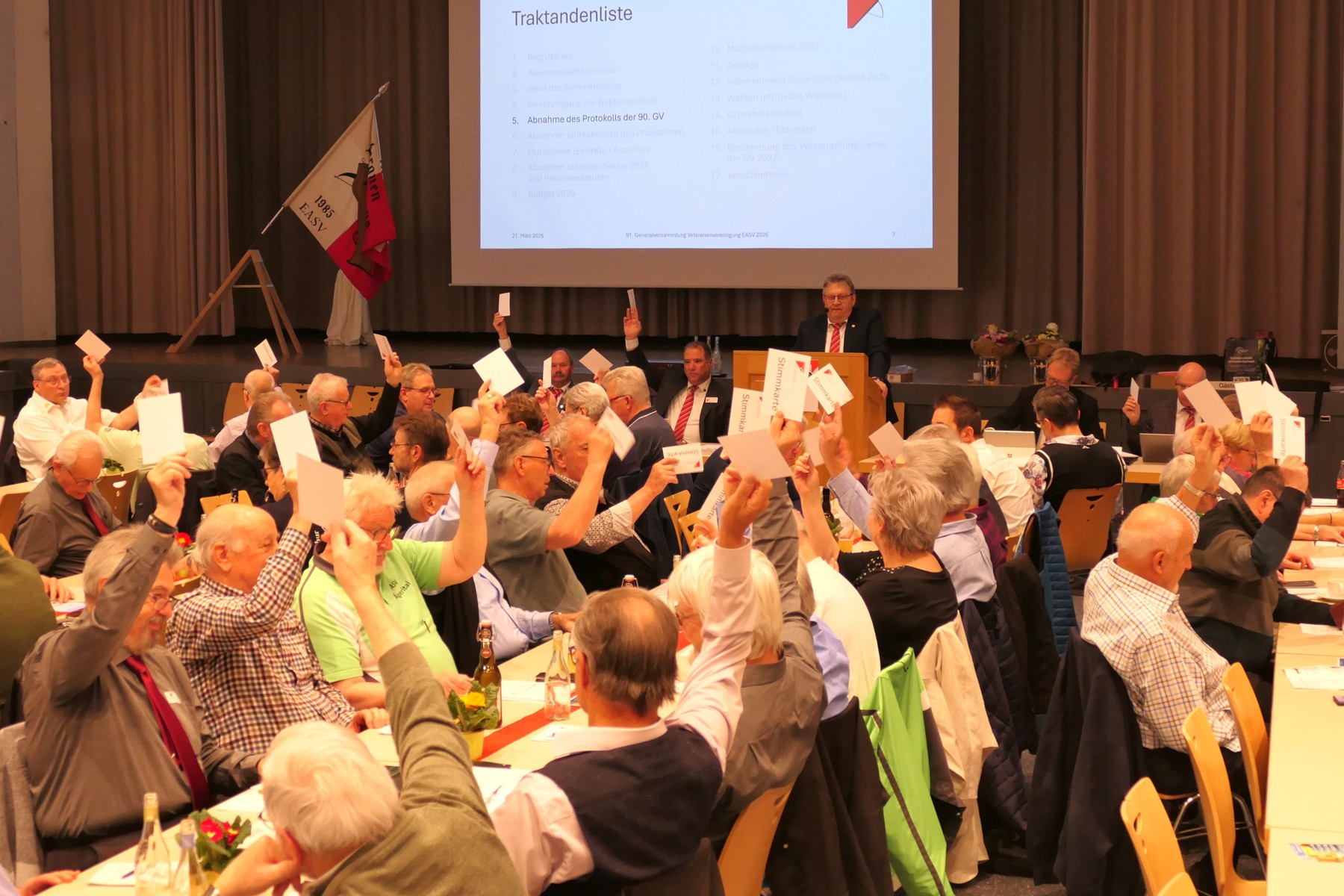 Die bisherigen Vorstandsmitglieder wurden ohne Gegenstimmen für die nächste Amtszeit bestätigt – das gilt auch für den neuen Kassier Hans Gerber. Wie im letzten Jahr verzeichnete die Vereinigung auch diesmal einen Mitgliederrückgang. Ende 2025 waren noch 417 Personen in der VVEASV registriert. Der im Jahr 2025 verstorbenen Kameraden wurde mit einer Schweigeminute und einem andächtigen Musikstück gedacht. Die anwesenden Veteranen des Jahrgangs 1956 erhielten den goldenen Pin der VVEASV, die über 80-jährigen Versammlungsbesucher durften eine Flasche Wein empfangen.