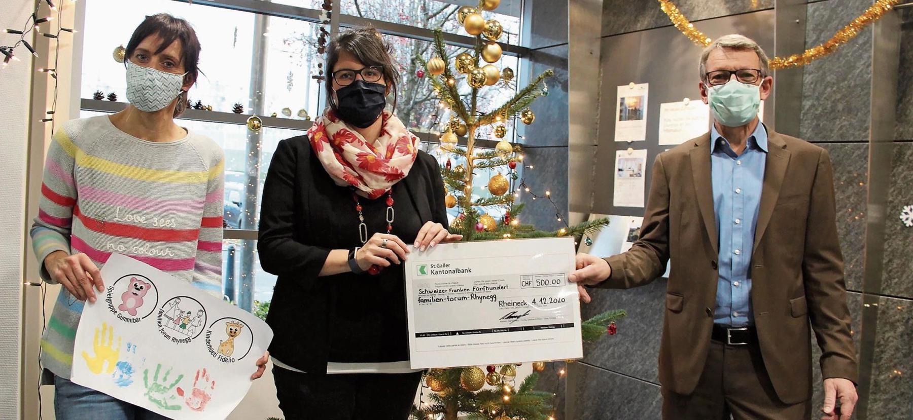 Als regional verankerte Bank will die St. Galler Kantonalbank auch in der aktuell herausfordernden Zeit verbinden. Mit ihrer Weihnachtsaktion dankt sie allen Mitarbeitenden sozialer Institutionen und Trägervereine, die durch ihr Engagement täglich ein Zeichen des Miteinanders und der Nächstenliebe setzen. So dürfen sich zur Adventszeit in rund 15 SGKB-Kundenhallen soziale Institutionen aus der Region präsentieren, um auf sich und ihre Dienstleistungen aufmerksam zu machen. Darüber hinaus schenkt die Bank den teilnehmenden sowie weiteren 19 Organisationen einen «Zustupf» von jeweils 500 Franken. Die Niederlassung Rheineck unterstützt in diesem Jahr das Familien-Forum Rhynegg mit einem Spendenbeitrag von 500 Franken. Der Verein wurde im Jahr 1999 gegründet. Nebst den Angeboten der Spielgruppe «Gummibär» und der Kinderhüeti «Fidelio» geht es dem Familien-Forum Rhynegg vor allem darum, den Austausch un-ter Familien zu fördern und gemeinsame Anlässe anzubieten. (pd)