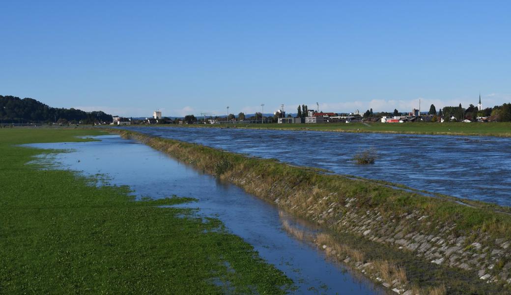 Es ist ungewöhnlich, dass der Rhein im Oktober so viel Wasser führt, dass er ins Vorland läuft. Der viele Regen, der im Bünderland seit gestern Freitag niederging, liess den Rhein stark anschwellen. Der Höchststand ist noch nicht erreicht. Das Rheinunternehmen erwartet ihn gegen 20 Uhr. In Widnau läuft der Rhein bereits über den Innendamm ins Vorland.