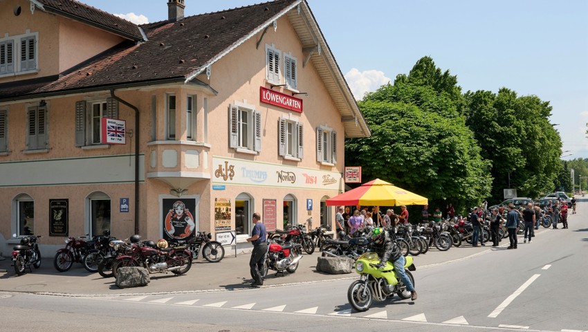 Das Lokal, wo dieses stattfindet, hat eine besondere Geschichte. Bruno und Jane Gächter wohnten in Widnau. «Da hatte ich nur eine kleine Garage», sagt Bruno Gächter. Als die Brauerei Löwengarten das ehemalige Restaurant Löwen mit Bierdepot in Rüthi verkaufte, schlug das Ehepaar zu. Bruno Gächter sagt: «Jane hatte gesagt, sie führe das Restaurant. Aber sie will einen Treffpunkt für Motorradfahrer.» 2004 haben die beiden das Restaurant mit Depot an der Bahnhofstrasse in Rüthi gekauft und es fortan zu einem Motorradlokal umgebaut. Es entstand ein Restaurant in britischem Stil mit grossen Schriftzügen legendärer englischen Motorradmarken an der Hausfassade.