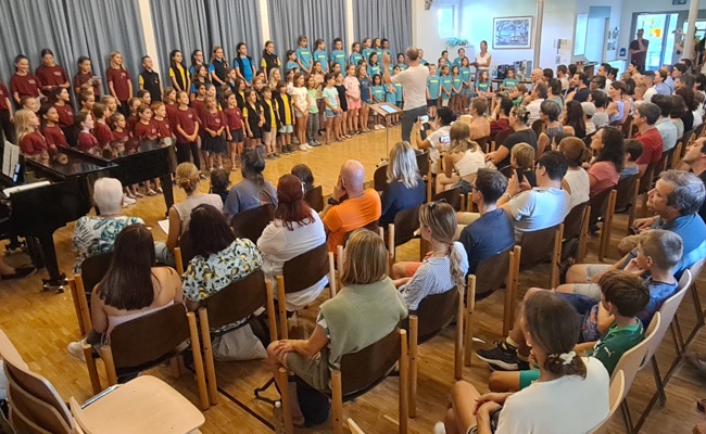 Nun begannen die Proben der gemeinsamen Lieder. So wurden im Laufe des Morgens eine vielseitige Auswahl von neun Liedern einstudiert. Es gelang den Chorleiterinnen und Chorleitern, die grosse Kinderschar zu motivieren und zu begeistern. Die kleinen und grossen Kinder waren mit sehr viel Konzentration, Engagement und Freude am Proben. Am Nachmittag wurde an den am Morgen geübten Liedern geschliffen und verfeinert. Zum Abschluss des Tages präsentierte der Gesamtchor alle neun Lieder einem interessierten Publikum. Der Chor begeisterte mit der abwechslungsreichen Liedwahl und der hohen Qualität des Gesangs.