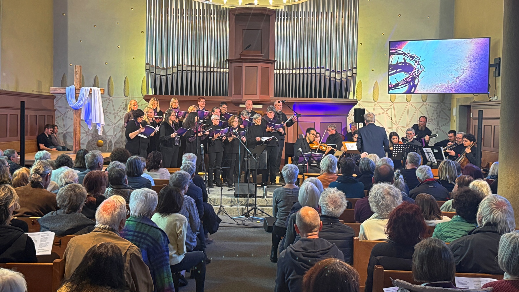 In der bis auf den letzten Platz gefüllten Kirche entstand so ein eindrucksvolles, klanggewaltiges Pop-Oratorium, das das Publikum spürbar bewegte und begeisterte. Das Chormusical «7 Worte vom Kreuz» thematisiert die letzten Momente von Jesus Christus am Kreuz. Im Zentrum stehen seine sieben letzten Aussagen – Worte, die von Vergebung, tiefem Vertrauen in Gott, Hoffnung und Erlösung erzählen und die Zuhörenden auf eindringliche Weise ansprechen.