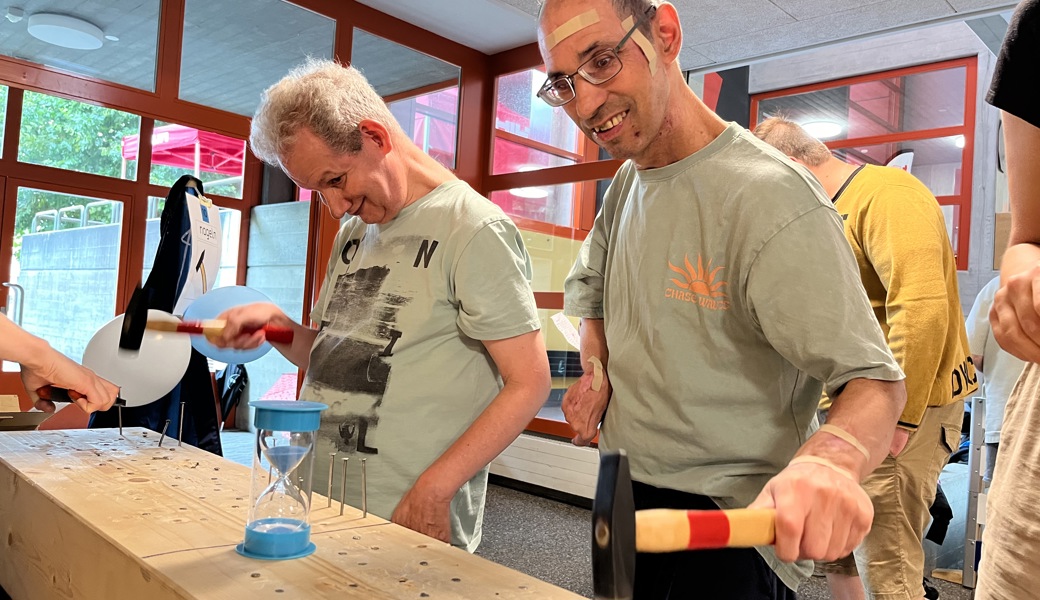 An verschiedenen Posten versuchten die rund 75 Sportlerinnen und Sportler, möglichst viele Punkte zu holen. Der Parcours kann von allen Teilnehmenden gemacht werden. Wenn jemand ein bisschen Hilfe braucht, stehen Angehörige und Betreuende zur Seite. So werden Nägel eingeschlagen, Bälle transportiert, Socken aufgehängt oder Gegenstände ertastet. Für Menschen mit eingeschränkter oder fehlender Lautsprache standen für eine gelingende Kommunikation Symboltafeln zur Verfügung.