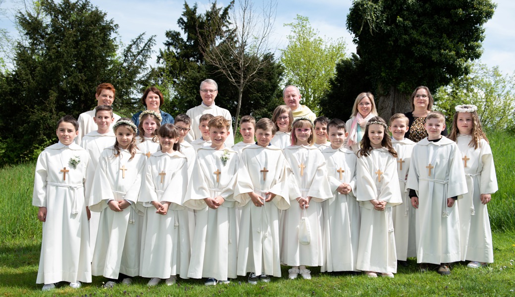 Auf diesen besonderen Tag wurden die Erstkommunionkinder von den drei Sunntigsfiirleiterinnen Sabina Bösch, Katja Germann und Madeleine Baumgartner, sowie von Religionslehrerin Silke Schlör und dem Pfarreibeauftragten Richard Schmidt im Religionsunterricht vorbereitet.
