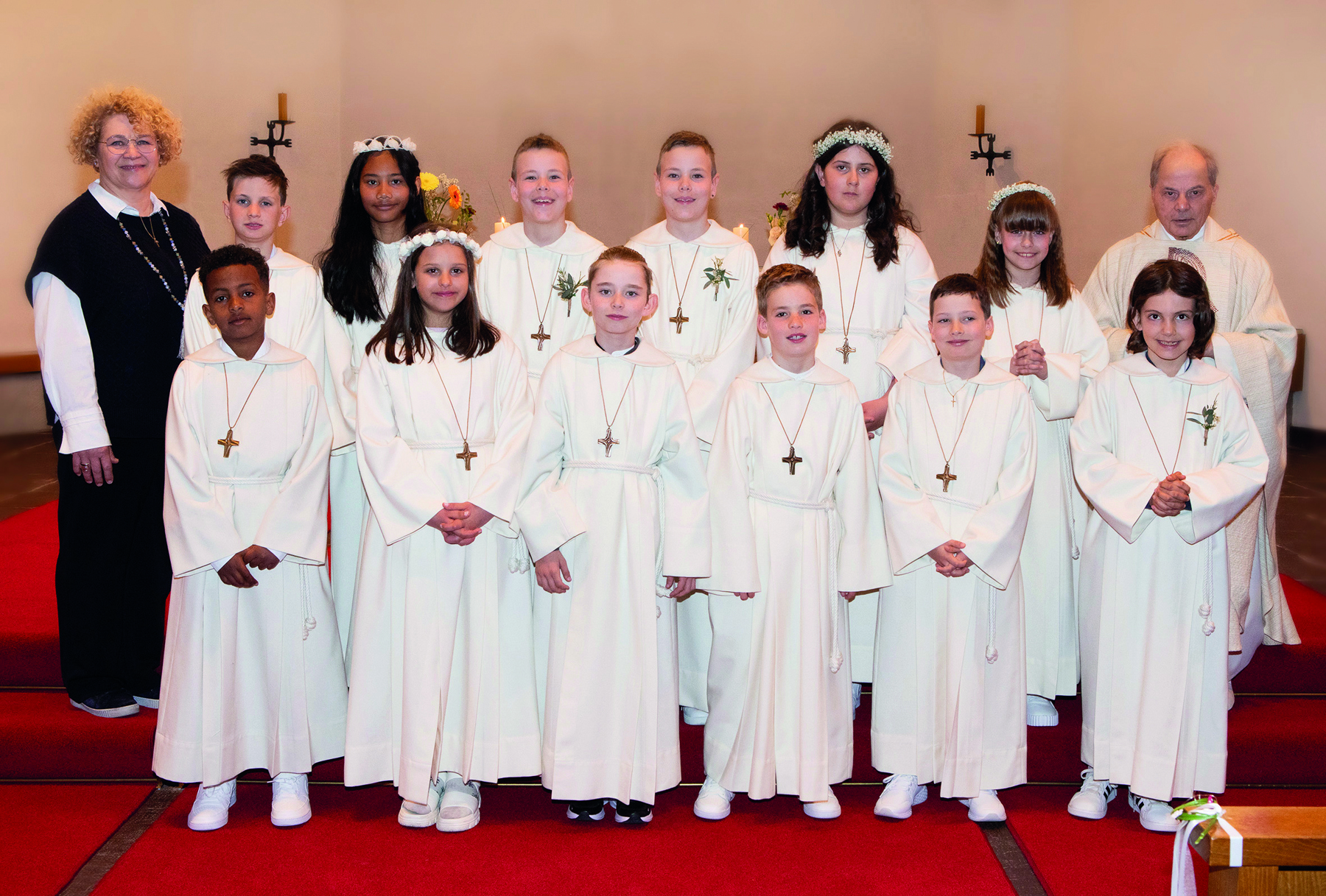 Als Geschenk der Pfarrei bekamen die Erstkommunionkinder ein Kreuz und ihre selbst verzierten Kerzen.