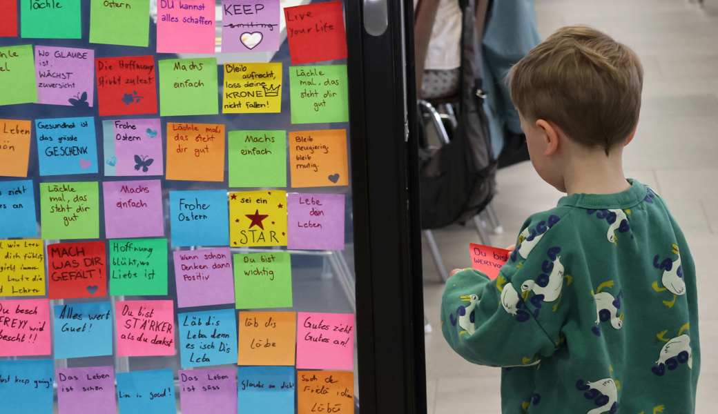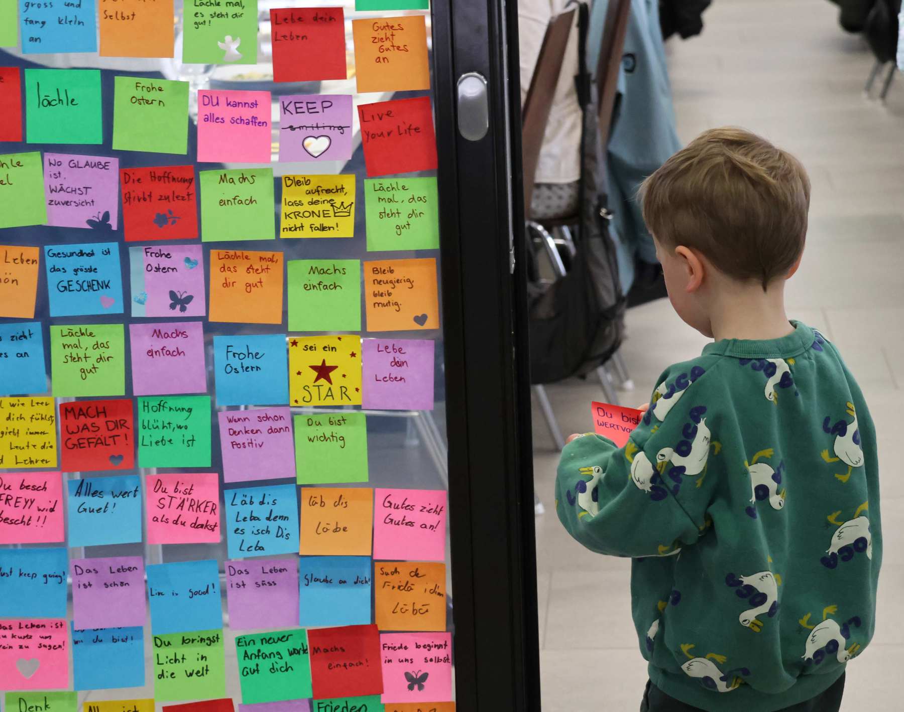 Ein besonderes Zeichen für Hoffnung und Zuversicht setzten Schülerinnen und Schüler der 3. Oberstufe des OZM: Sie gestalteten eine Fensterwand mit «Frohe Botschaft»-Post-its, von denen die Besucherinnen und Besucher eine kleine Portion Optimismus mit nach Hause nehmen konnten.