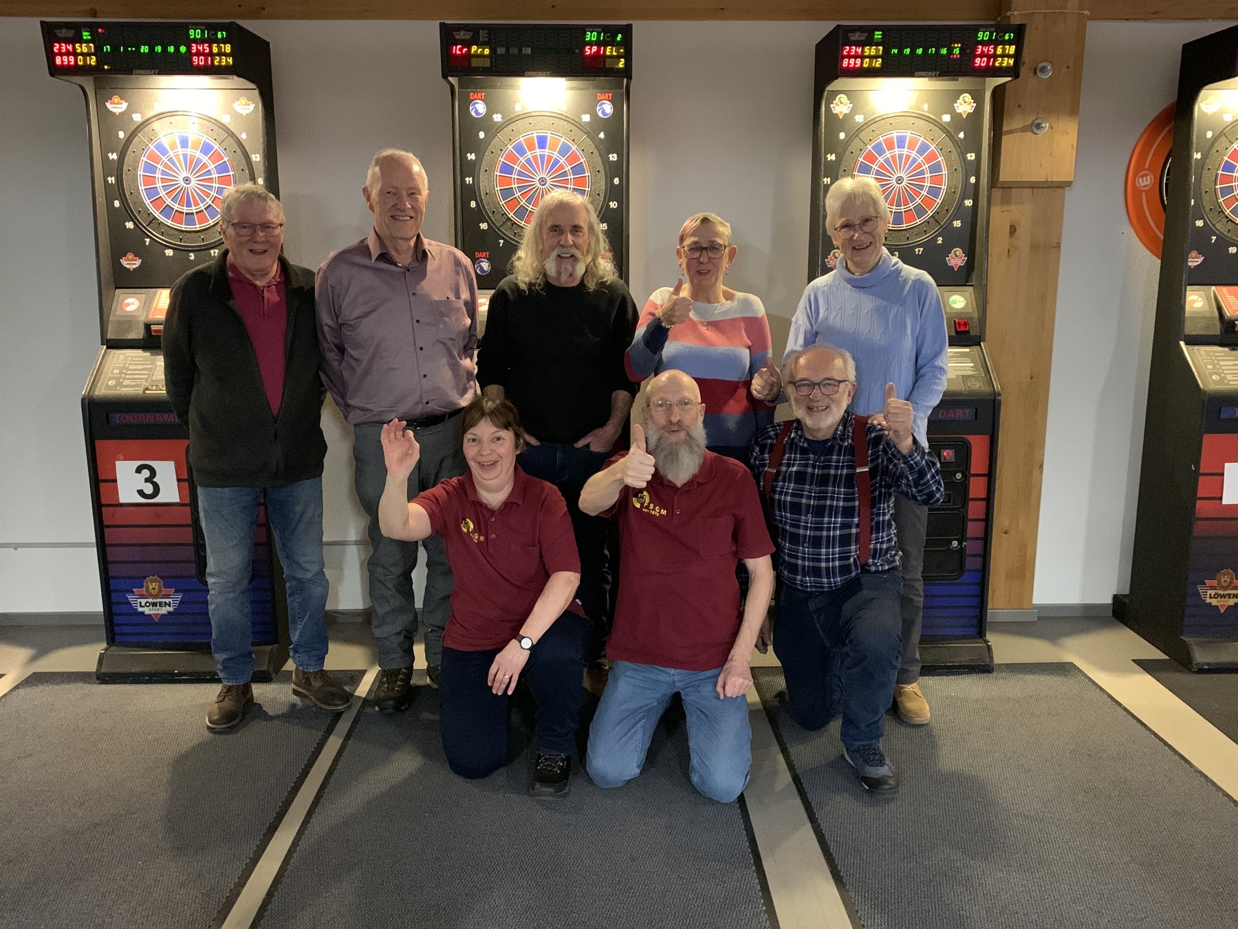 Im zweiten Stock des Gebäudes besuchte die Wandergruppe den Dart-Club Falcons Rheintal. Im Clublokal ruhte sie bei einem Getränk aus und wartete Gruppenzusammensetzung sieben Runden. Von 301 Pt wurde auf Null heruntergespielt. In der Rangliste wurden zwei erste Plätze aufgezeigt. Nach kurzem Spiel und dem siegbringenden Treffer war eine Siegerin erkoren. Zu später Stunde wurde wieder das Dorf angesteuert.