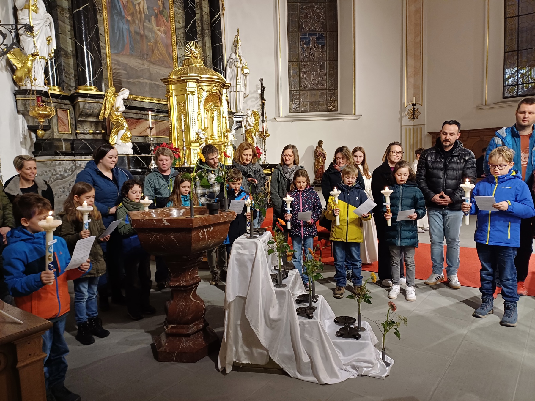 In Kleingruppen konnten Kostbarkeiten in der Sakristei entdeckt werden. Spannend war im Pfarrhaus der Einblick ins älteste Taufbuch der Pfarrei mit dem ersten Eintrag aus dem Jahr 1732. Einige Eltern und die meisten Kinder fanden den Eintrag ihrer eigenen Taufe in neueren Taufbüchern.
