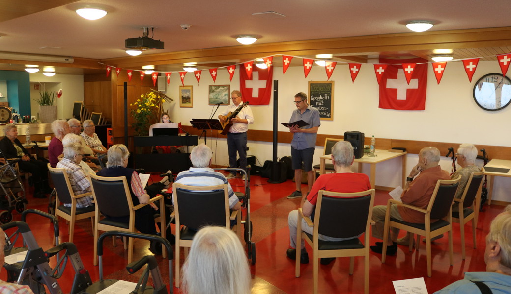 Aufgrund des schlechten Wetters musste der vorgesehene Grillmittag kurzfristig umdisponiert und nach drinnen verlegt werden. Beim anschliessenden Dessertbuffet fanden die Bewohnenden die vielen liebevoll angerichteten Süssigkeiten vor. Zu den Klängen der Musik liessen die Bewohnenden die 1. Augustfeier ausklingen und genossen das Nachtessen, bevor sich alle müde und glücklich in ihre Zimmer verabschiedeten.