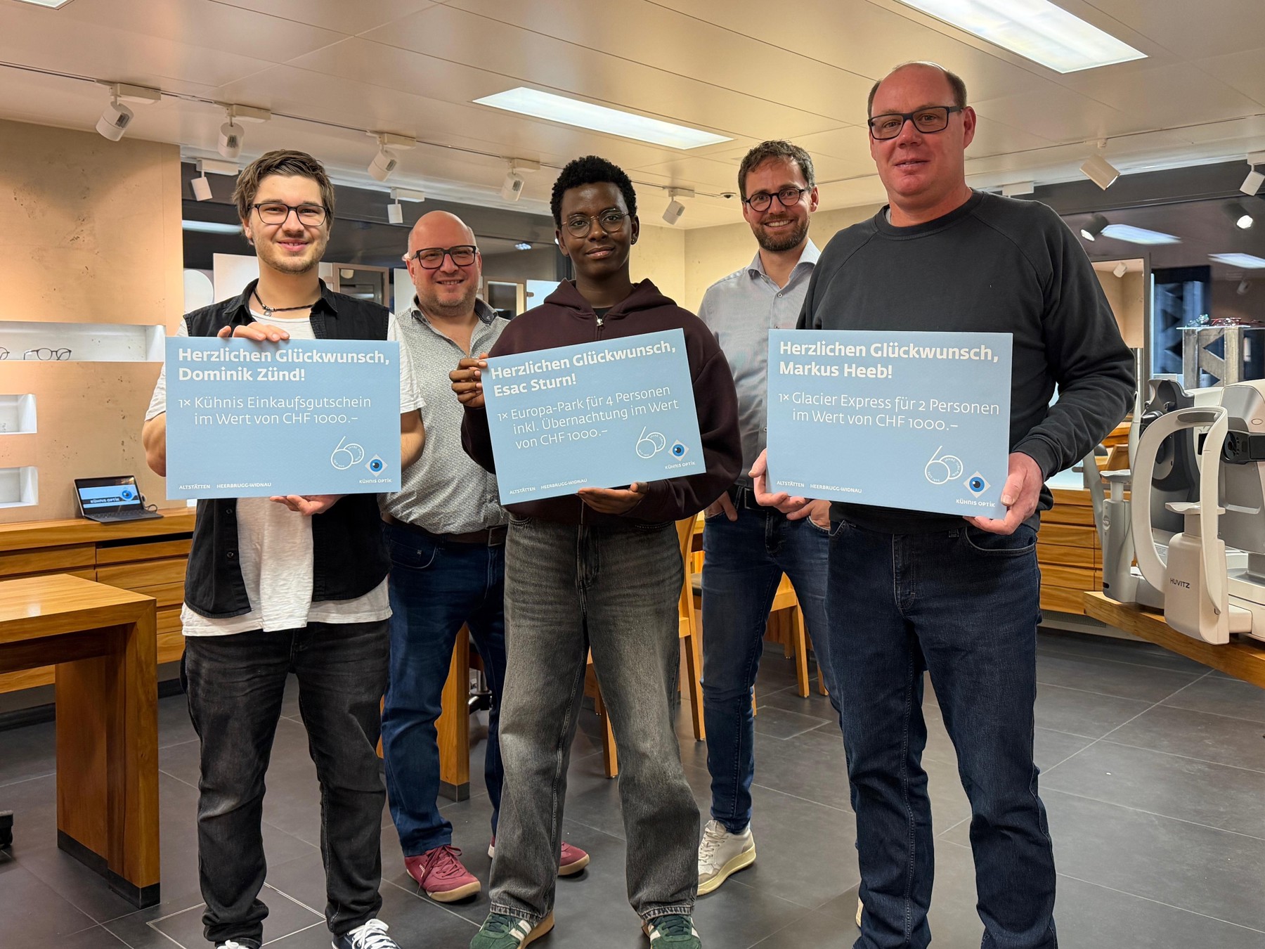 Zum 60-jährigen Bestehen von Kühnis Optik wurden die drei Hauptgewinne des Jubiläumswettbewerbes ausgelost. Das Bild zeigt die glücklichen Gewinner der drei Hauptpreise im Wert von jeweils 1000 Franken.