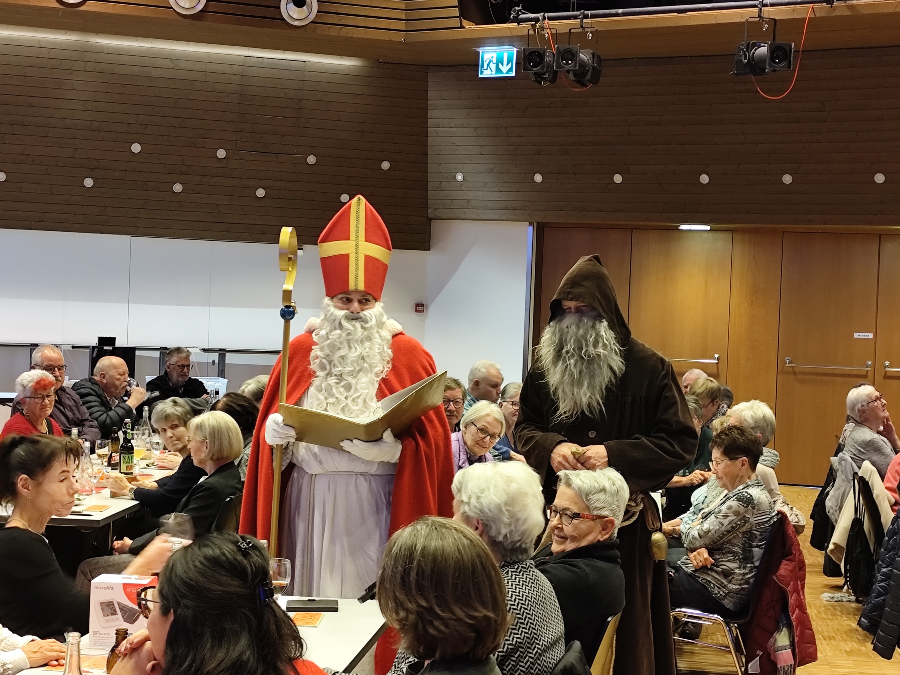 In der Pause machte der Samichlaus mit Schmutzli seine Aufwartung. Er hielt an jedem Tisch kurz inne, «knöpfte» sich den einen anderen vor, war aber allen milde gesinnt und belohnte sie mit einem Biberli. Zur Überraschung aller wussten einige Damen mit langen Gedichten alle Anwesenden zu verblüffen.