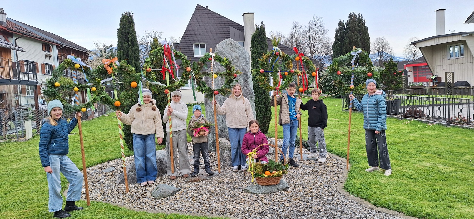 Die Schülerinnen und Schüler der fünften sowie sechsten Primarklassen mit deren Geschwister stellten die Palmen für den Gottesdienst her: Mit Unterstützung ihrer Mütter, Väter, Grossmüttern wurden die Palmen am Samstagmorgen mit viel Einsatz und Fantasie im Pfarreizentrum geschmückt.