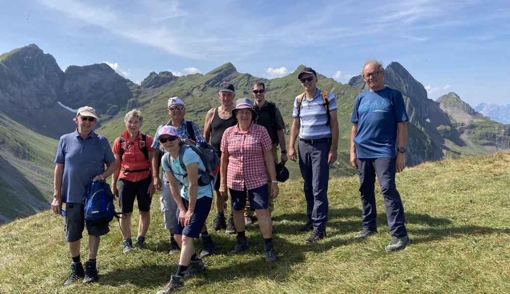 Das Finale war schnell erreicht: Auf der weiten Gipfelhochfläche gruppierten sich die Wandernden um das metallene Gipfelzeichen mit der aufgesetzten Metallkugel (2164 m). Der breite Rastplatz bot eine beeindruckende Aussicht über das 1700 Meter tiefer liegende Rheintal im Osten, bis hinüber ins Rätikon, und im Süden in die Alvierkette mit ihren charakteristischen Gipfeln. Nach Norden erstreckte sich die Rückansicht der Alpsteinkette mit den Hügelzügen des Appenzeller Vorderlandes und dem Bodensee.