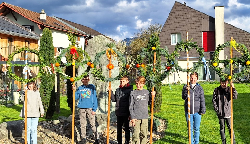 Traditionsgemäss durften die Schülerinnen und Schüler der 6. Klasse die Palmen für den Gottesdienst herstellen. Mit Unterstützung ihrer Mütter, Väter oder der Gotta, wurden die Palmen am Samstagmorgen mit viel Einsatz und Fantasie im Pfarreizentrum geschmückt. Am Beginn des Familiengottesdienstes durften die Schülerinnen und Schüler in einem feierlichen Einzug die Palmen in die Kirche tragen und im Chorraum platzieren.