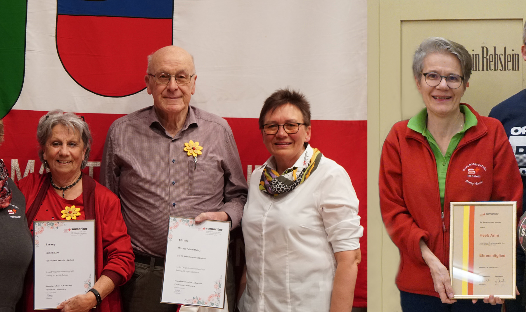 Seit 50 und sogar 52 Jahren sind Lisbeth Lutz und Werner Schmidheiny Aktive in Rebstein. Für diese Leistung wurden beide an der Delegiertenversammlung des Samariterverbandes SG/FL geehrt. Lisbeth Lutz ist die gute Seele bei den Rebsteiner Samaritern und dort ebenfalls Ehrenmitglied.