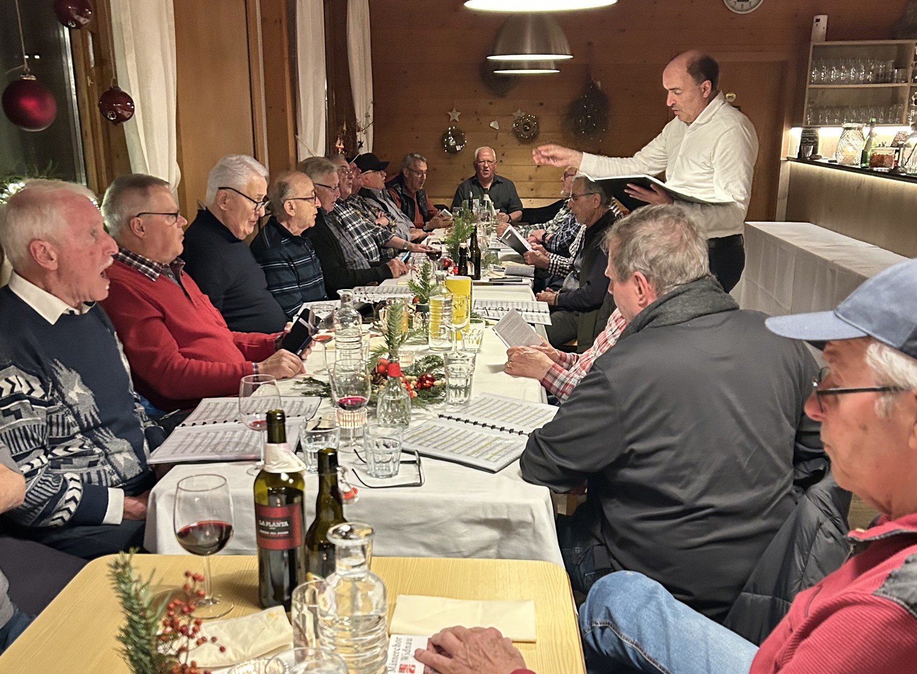 Dazu genossen die 22 sangesfreudigen Leica-Sänger die Gastfreundschaft der Widnauer Ortsgemeinde und trafen sich für einmal ennet der Grenze. Da wurden sie namens der Kommission von Stefan Spirig willkommen geheissen. Vorerst aber galt Mathias Eggenberger für die Einladung zum Apero im weihnächtlich dekorierten Gastgarten ein fröhliches «Happy Birthday». Stefan Spirig wies alsdann darauf hin, dass es bereits am 5. Januar gelte, das neue Sängerjahr zu planen.