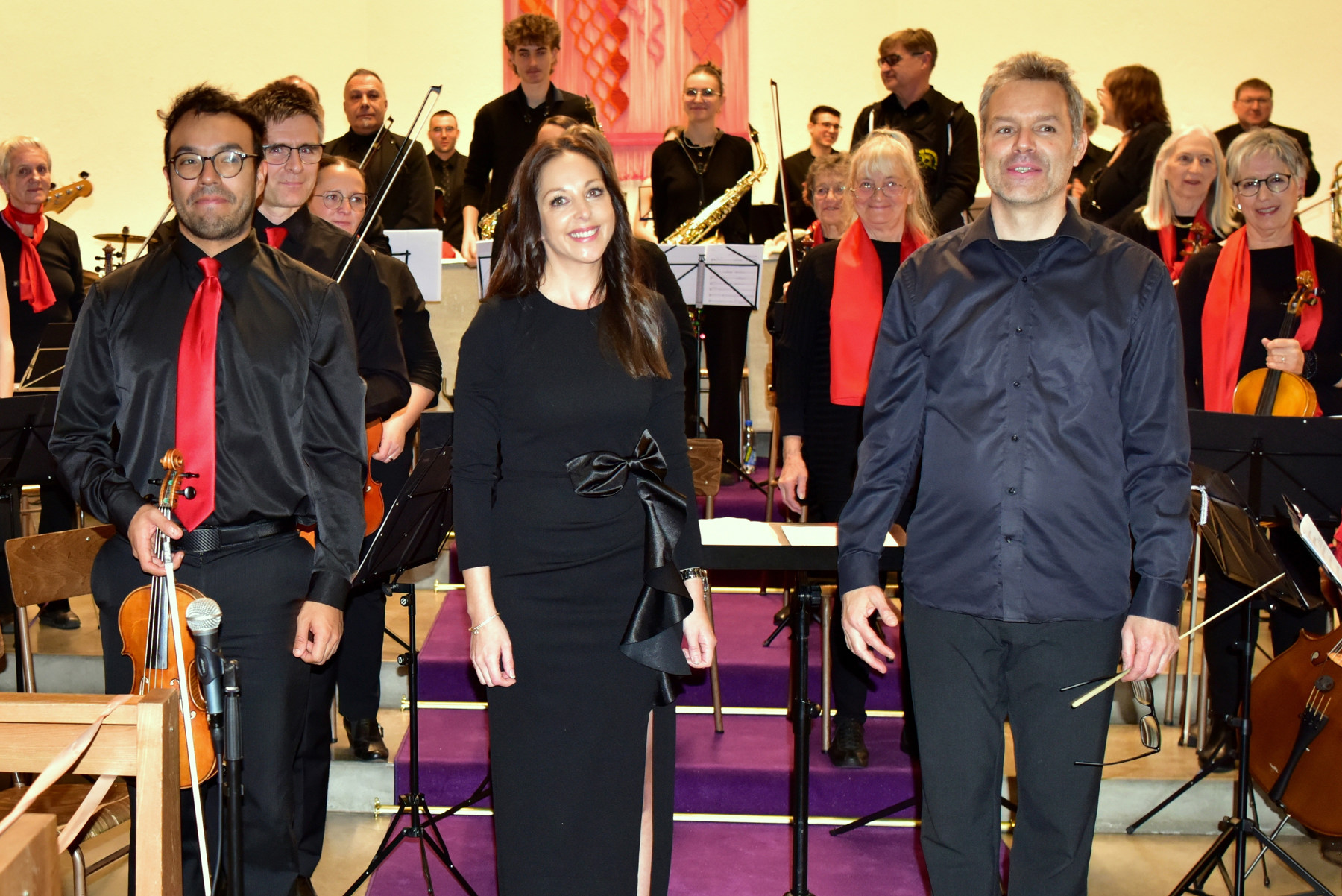 Im folgenden Block dirigierte Mario Haltiner die SSC Big Band. Zuerst mit zwei Weihnachtsliedern. «Jingle Bell» und «My Fairy» wurden eher auf volkstümliche Art gespielt. Gemeinsam mit dem Orchesterverein wurde anschliessend die bekannte «Moonlight-Serenade» aufgeführt. Auch der männliche Solosänger der Jazzband, Manuel Gygax, trat nun in Aktion. Sein Gesang war ein Höhepunkt für die Zuhörer. Die SSC Big Band erwies sich immer wieder als aufgestellte Jazz-Formation, zu der in letzter Zeit auch jüngere Mitglieder gestossen waren. Mit hervorragenden Solos zeigten verschiedene Exponenten ihre Fähigkeiten. Die weihnachtlichen, gemeinsamen Zugaben mit beiden Solosängern brachten endlosen Beifall.