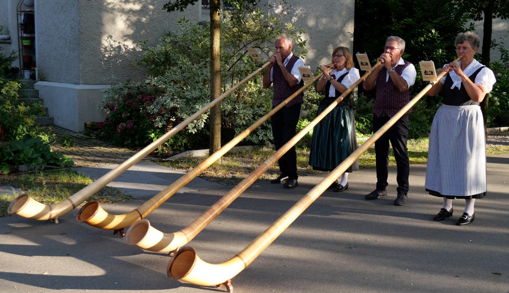 Ab 19.00 Uhr unterhielt die Alphorngruppe Seeblick. Unter den alten Bäumen bei der Kirche, die eine tolle Kulisse boten, spielten sie in drei Teilen verschiedene Alphornweisen. So gab es etwas später nach dem Auftritt eine wundervolle Zugabe. Die Gäste genossen den Abend und hatten es nicht eilig, nach Hause aufzubrechen.