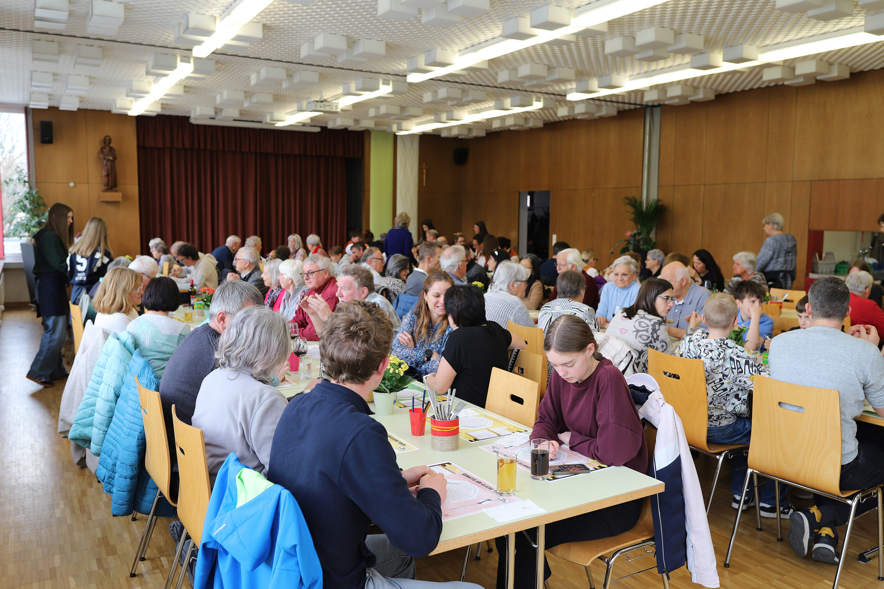 Ein grosses Team freiwilliger Helferinnen und Helfer war anschliessend beim Suppentag im Pfarreiheim bestens organisiert und setzte damit ein schönes Zeichen christlicher Zusammenarbeit. Neben Erwachsenen halfen auch Ministrantinnen und Ministranten der Bruderklausenpfarrei sowie Konfirmandinnen und Konfirmanden der evangelischen Gemeinde tatkräftig mit. Sie servierten feine Suppen mit Wienerli und boten dank zahlreicher Kuchenspenden eine grosse Auswahl an süssen Köstlichkeiten an.