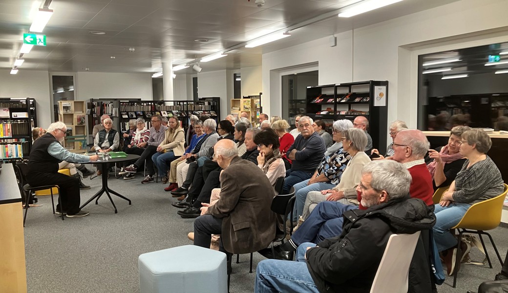 Das Publikum horchte den Episoden aus seiner Schul- und Lehrerzeit in diesem Gebäude, wie vom Glöggli, das nicht mehr läuten darf, weil es abgebrochen wurde. Ebenso erwähnte er die viel benutzten Liederbüchlein von Musiker Hans Roelli, die man für 10 Rappen am Kiosk kaufen konnte.