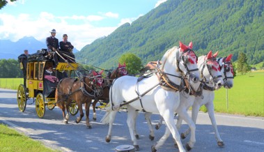 Kutschenfahrt Von Wildhaus über Grabs nach Weite Der Toggenburger Sandro Scherrer ist mehrere Tage mit Gästen in einer Postkutsche unterwegs. Das Gespann zieht Blicke auf sich.